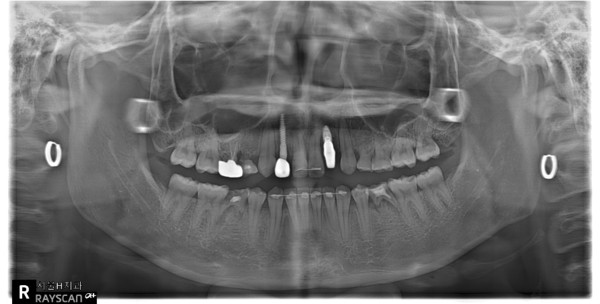 양측 모두 처음에는 골이식없이 2.5직경의 onebody implant를 식립하였는데 22번의임플란트는 골유착 실패로 제거하게 되었습니다. 다시 마무리 교정을 한 후에 4개월 후 22번에 3.5직경의 임플란트를 골이식과 더불어 식립하였고 최종 보철물을 마무리하였습니다.