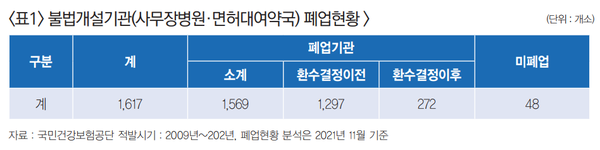 국민건강보험공단 자료에 따르면, 지난 2009년부터 2020년까지 적발된 불법개설기관은 총 1,632개소다. 이중 휴·폐업기간을 파악할 수 있는 1,617개소를 분석해보면, 그중에서 97%(1,569개소)가 폐업한 것으로 집계됐다. 당국에 적발된 사무장병원은 사실상 전부 폐업한다는 의미다. 미폐업 기관은 단 3%(48개소)에 불과했다.