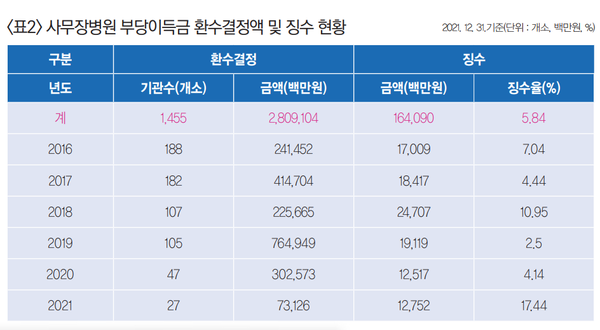 한편, 2009년부터 지난해까지 사무장병원과 면허대여약국이 부당하게 취득해 환수결정이 내려진 금액만 3조 3,674억원이 넘는다. 그러나 징수액은 2,026억원 수준으로, 징수율 6% 내외에 불과한 실정이다.
