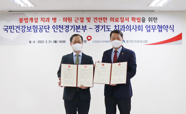 경기도치과의사회(회장 최유성, 이하 경치)가 지난 21일 회관 중회의실에서 국민건강보험공단 인천경기지역본부(본부장 서명철, 이하 공단 경인본부)와 ‘불법개설 치과 병ㆍ의원 근절 및 건전한 의료질서 확립을 위한 업무협약’을 체결했다.