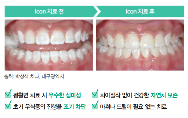 Icon으로 치료 후에는 법랑질 내부의 다공성 구조를 저점도의 레진인 Icon Infittrant로 채워준다. 이후 유해한 산(H) 성분의 침투가 더 이상 일어나지 않아 우식은 진행되지 않는다. 따라서 빛 굴절율(RI)은 자연 치아에 가깝게 회복시켜 건강한 자연치아와 같은 색처럼 빛을 반사시켜 우수한 심미성을 표현해 준다.