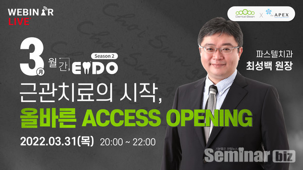이번 웨비나는 최성백(파스텔치과) 원장의 ‘근관치료의 시작, 올바른 ACCESS OPENING’의 주제로 강의가 시작된다.