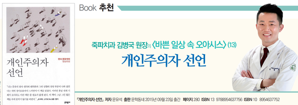 다른 작품들에 앞서 ≪개인주의자 선언≫을 가장 먼저 추천하는 이유는 이 책이 자아, 행복, 마왕 신해철의 죽음, 교육제도, 취업난 등 우리의 현실과 밀접한 주제들에 대해 냉철한 분석과 더불어 따뜻한 대안을 제시하기 때문이다. 책 전체를 흐르는 해박한 지식, 탁월한 균형감각, 약자에 대한 배려는 종착역인 서울역을 향하는 기차 안에서 철교를 지나며 처음 마주했던 한강만큼이나 커다란 울림을 준다.
