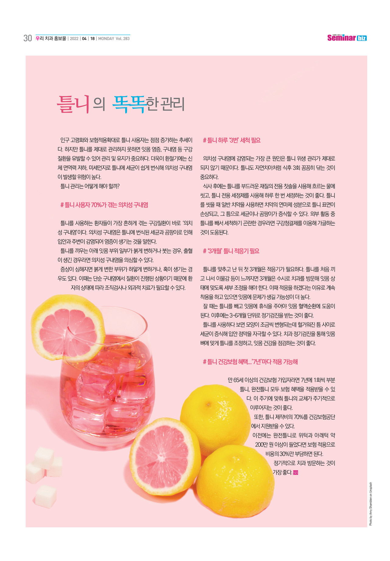 인구 고령화와 보험적용확대로 틀니 사용자는 점점 증가하는 추세이다. 하지만 틀니를 제대로 관리하지 못하면 잇몸 염증, 구내염 등 구강 질환을 유발할 수 있어 관리 및 유지가 중요하다.