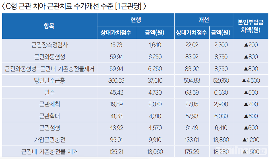 따라서 이번 수가 개선으로 C형 근관치아 치료 시 난이도가 높은 근관장측정검사, 근관와동형성, 당일발수근충, 근관확대, 근관성형10개 항목의 수가가 현행 대비 40% 인상된다.