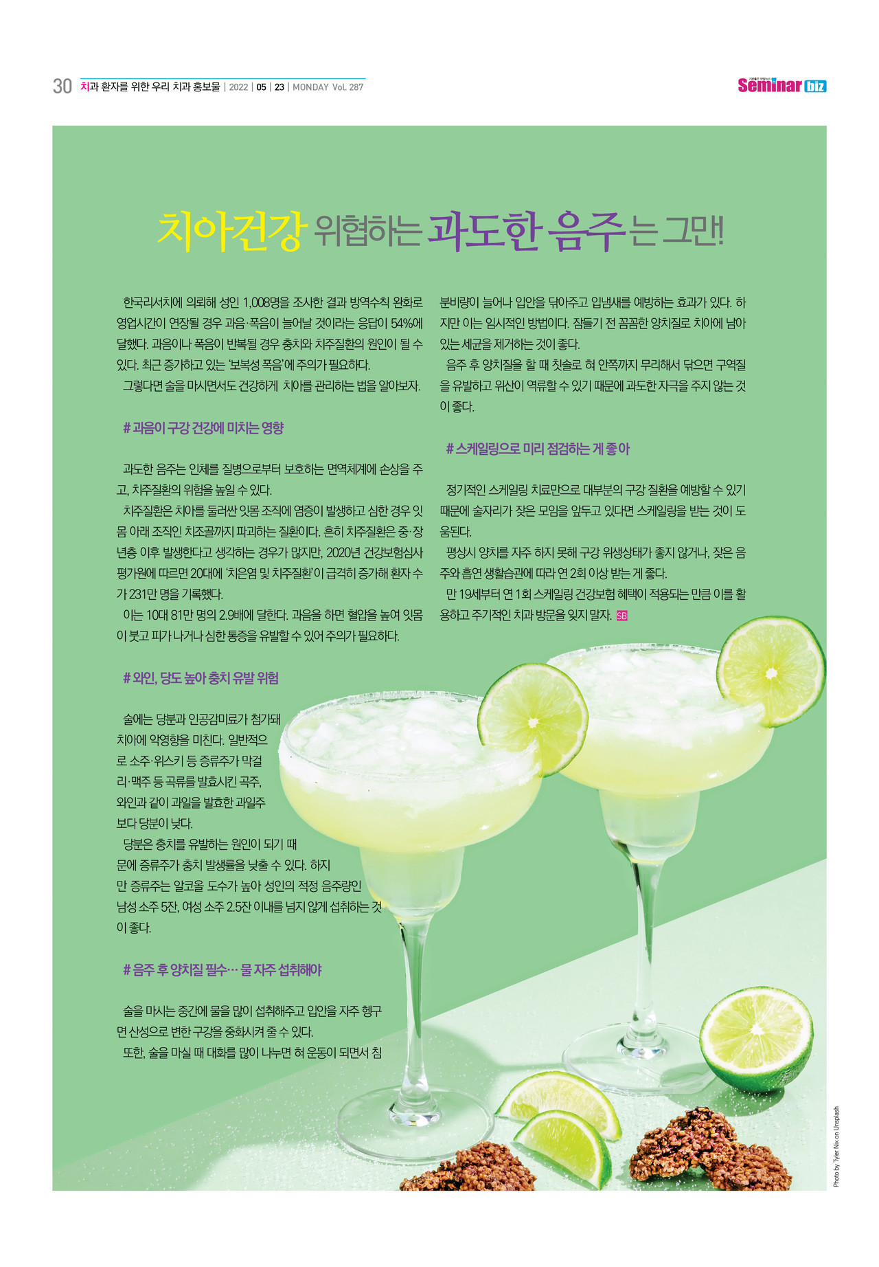 한국리서치에 의뢰해 성인 1,008명을 조사한 결과 방역수칙완화로 영업시간이 연장될 경우 과음·폭음이 늘어날 것이라는 응답이 54%에 달했다. 과음이나 폭음이 반복될 경우 충치와 치주질환의 원인이 될 수 있다.