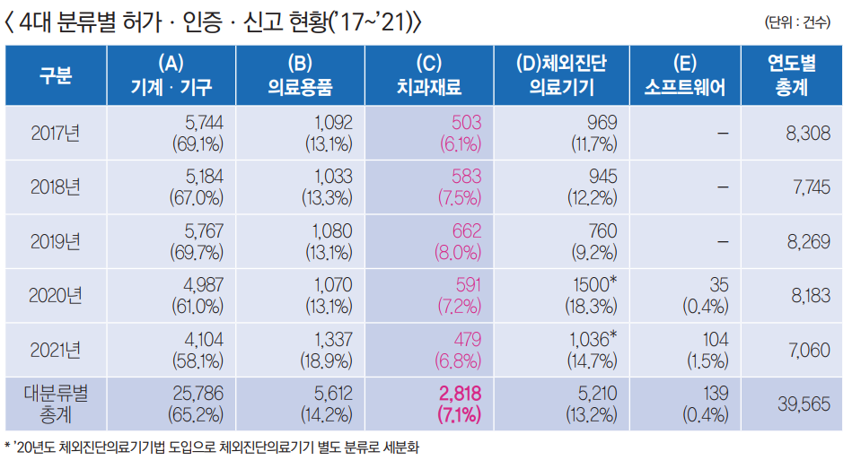 2021년 전체의료기기 품목허가(인증·신고 포함)수는 총 7,060건으로 2020년 대비 1,123건(13.7%) 감소한 가운데 2020년에 이어 2년 연속 국내제조 의료기기품목허가 비율이 수입을 추월했다.