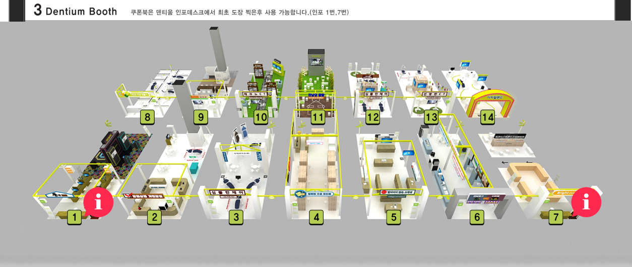 쿠폰북은 덴티움인포데스크에서 최초 도장을 찍은 후 사용 가능하다. 인포데스크는 1 번과 7번 부스를 방문하면 된다.