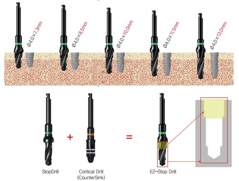 'EZ-Stop Drill Kit’는 Surgical Drill에 ‘Stopper Builtin’방식으로 Stopper 교체가 필요없이 Drill만 교체하면 된다.