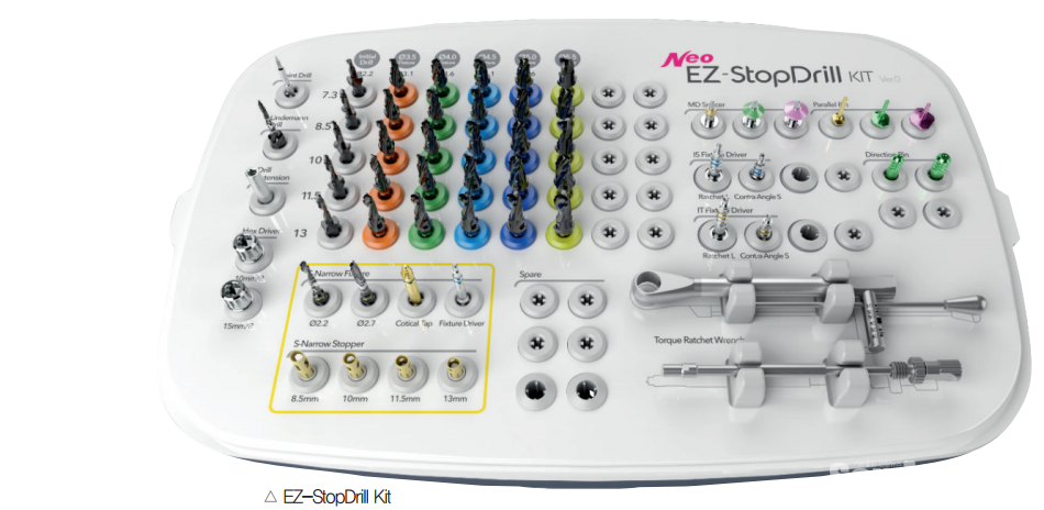 따라서 EZ-StopDrill Kit는 네오의 시술컨셉인 CMI fixation과 Immediate Loading 보다는 Conventional Loading 을 위한 수술키트로 개발됐다.