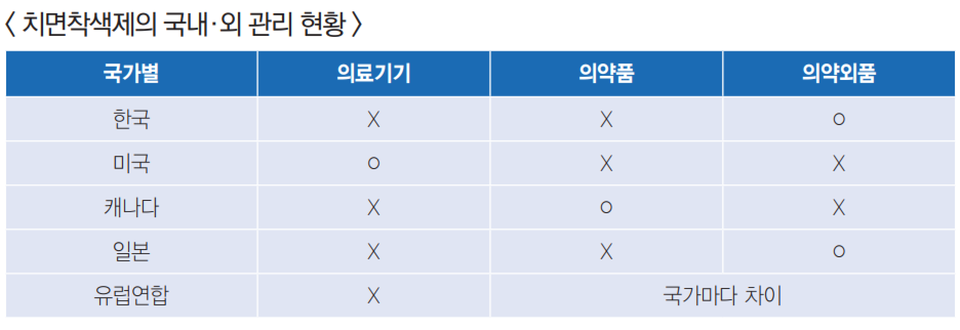 (자료 참고: 치과의료정책연구원 ISSUE& REPORT 제5호 치면착색제 부족현상과 해외관리현황 전지은 황수연선임연구원)