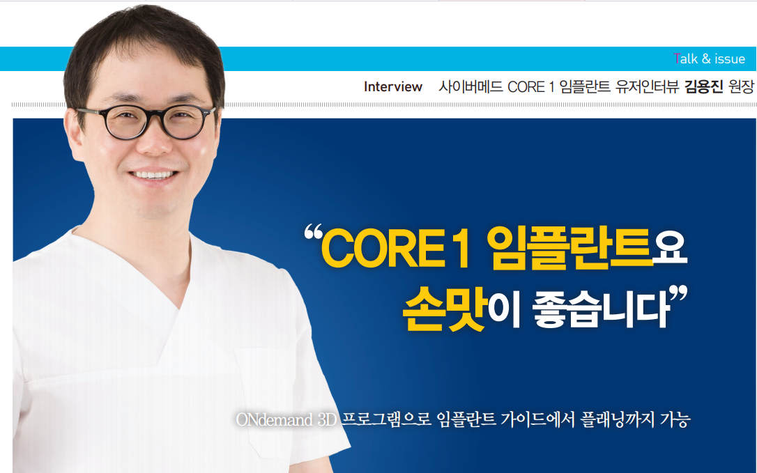 (주)사이버메드(대표 김철영)가 판매 중인 CORE 1 임플란트를 사용하는 김용진(포천 우리치과병원) 원장은 CORE 1 임플란트는 개발초기부터 연대 통합치의학과 교수들의 자문을 받아 만든 임플란트라고 설명했다. 김용진 원장은 CORE 1 임플란트는 국내에서 판매되는 거의 모든 임플란트 제품들과 연결되는 방식으로 모든 제품과 호환되는 것이 특징이라고 말한다.