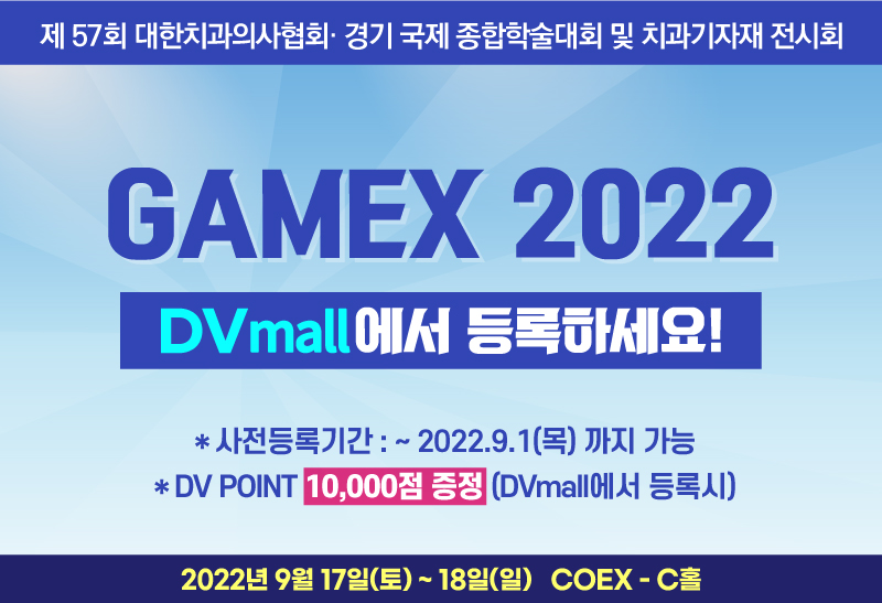 이번 GAMEX 2022 사전등록은 ‘온라인 치과 재료 쇼핑몰 No.1’, DV mall을 통해서 오는 9월 1일(목)까지 사전 등록이 가능하다.