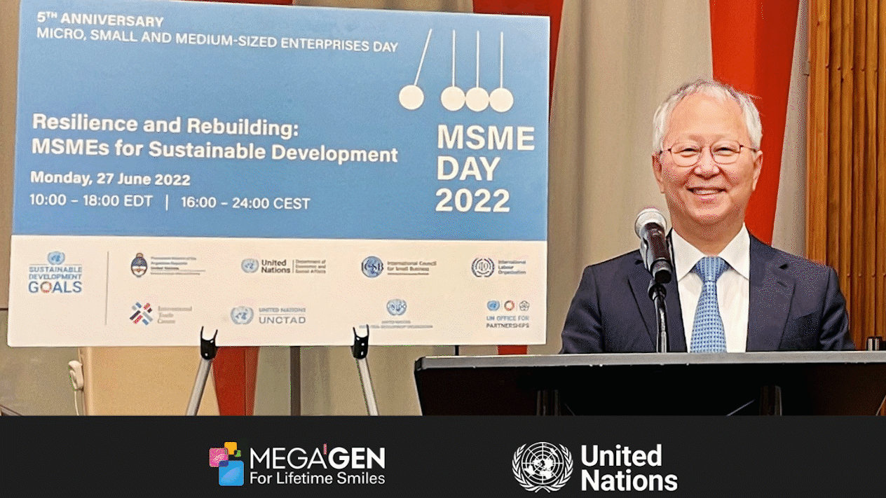 ㈜메가젠 임플란트(대표 박광범, 이하 메가젠) 박광범 대표가 지난달 27일 유엔(UN)과 세계중소기업협회 주최로 UN본부에서 진행된 ‘Humane Entrepreneurship Initiative(이하, HEI) Award 2022’에 연사로 참석해 메가젠의 기업 혁신사례를 설명했다.