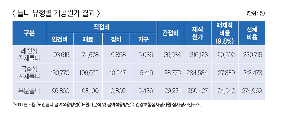 심평원의 조사결과에 따르면 레진상 전체 틀니의 경우 인건비 9만 3천 616원과 재료비 7만 4천여 원 등 제작 원가가 21만 원이며 레진상전체 틀니의 전체 비용은 23만원이며 재재작 비율도 9.8%에 달했다. 금속상 전체틀니의 전체 비용은 31만 2천 원, 부분틀니의 전체비용은 27만 4 천원이었다.