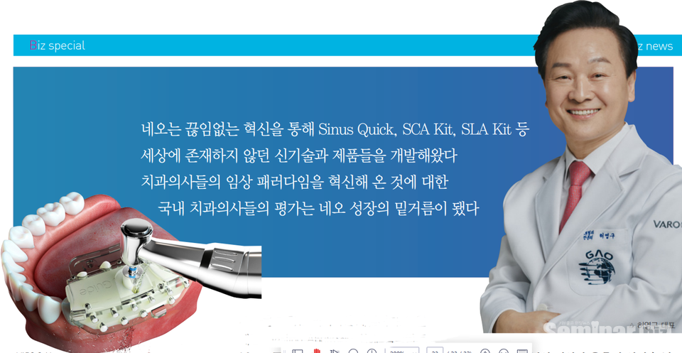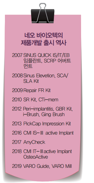지금까지 네오는 끊임없는 혁신을 통해 Sinus Quick, SCA Kit, SLA Kit 등 세상에 존재하지 않던 신기술과 제품들을 개발해 왔다. 아울러 치과의사들의 임상패러다임을 혁신해 온 것에 대한 국내 치과의사들의 평가는 네오 성장의 밑거름이 됐다.