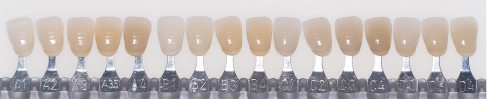 치아색을 정확하게 interpretation 하더라도 단일색상이 아니다. 16 개의 shade tab 중에서 해당 치아와 어울리는 색을 선택한다. 이 과정은 color matching이라는 표현이 더 적합하다.