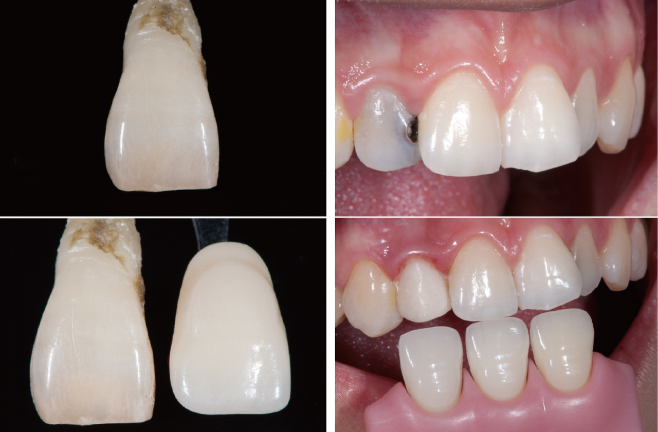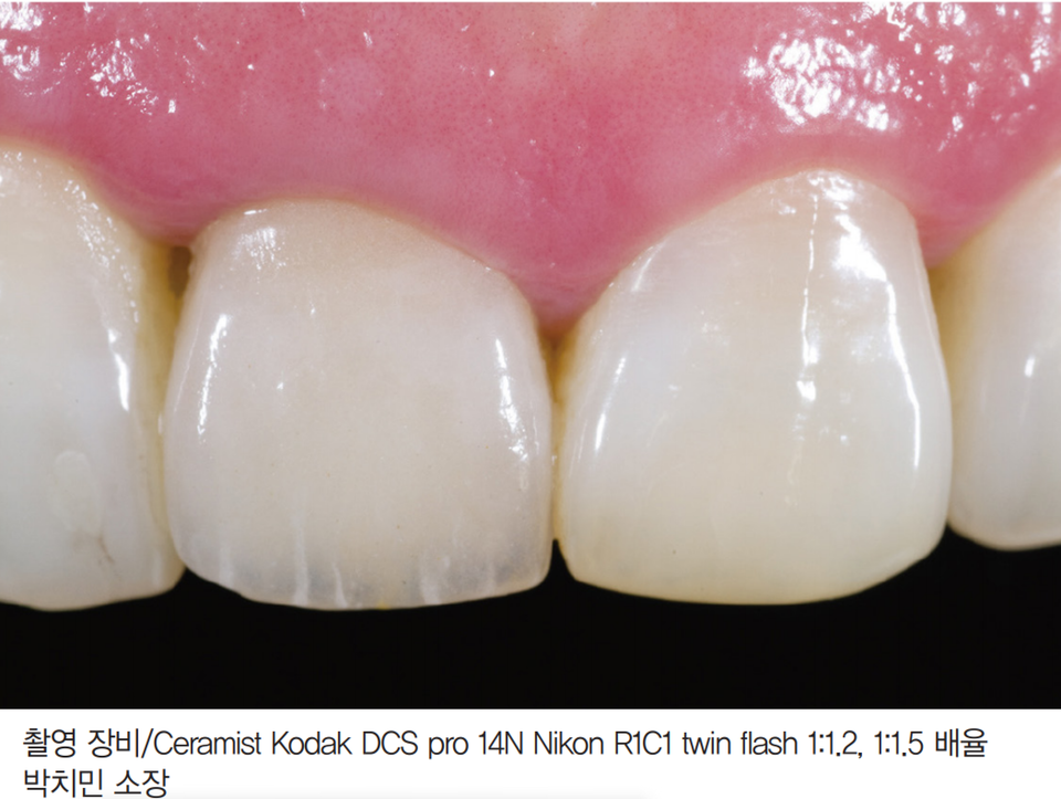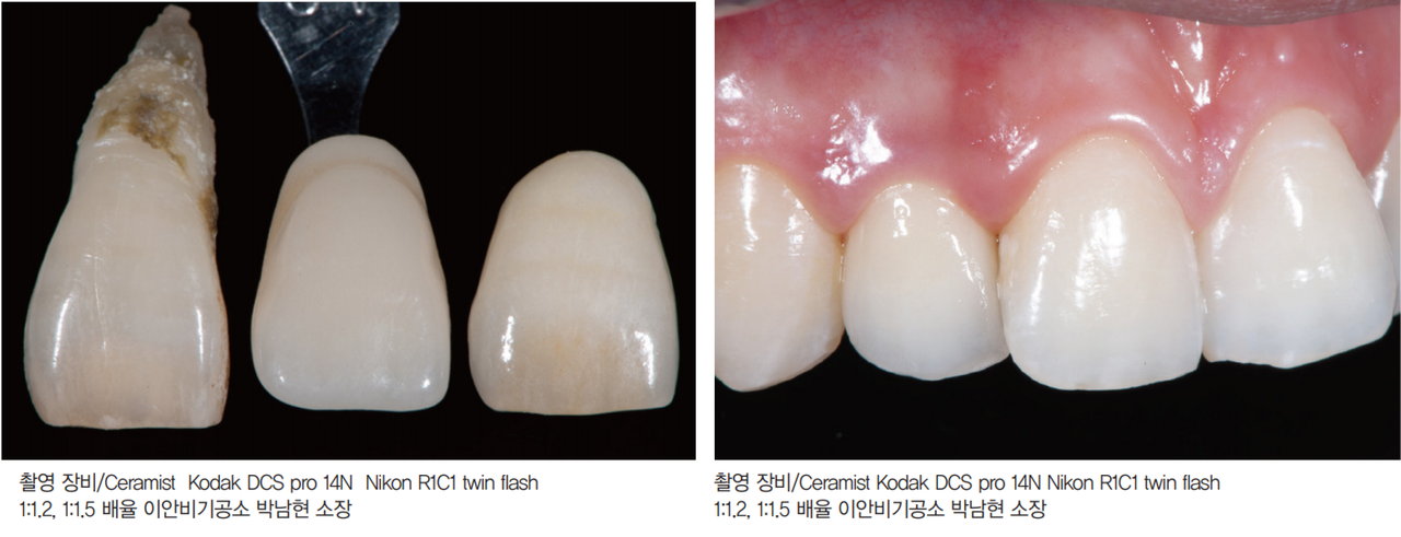 보철 작업은 치과의사와 치과기공사가 함께하는 ceramic art이다. 우측 중절치 재보철을 위한 ceramic art에는 정확한 색상파악이 필요하다. 제한적이지만 shade tab이 중요한 interpretation 도구이다.