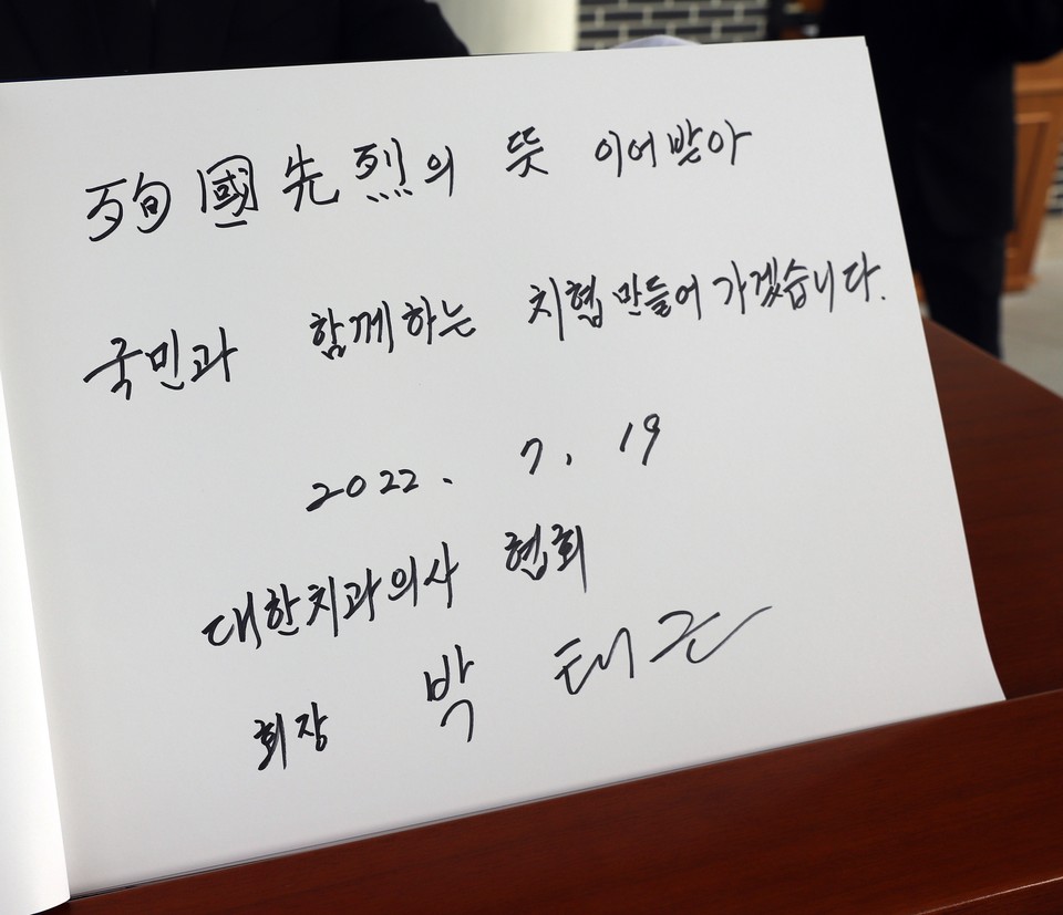 박태근 협회장은 방명록에 ‘殉國先烈의 뜻 이어받아 국민과 함께하는 치협 만들어가겠다’는 각오를 다졌다.