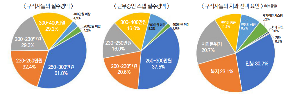 전체 응답자의 실수령 월급여에 비해 구직자들의 희망 월 급여가 다소 낮은 것은 치 위생과졸업자 등 신규 취업자가 상대적으로 많기 때문으로 풀이된다.