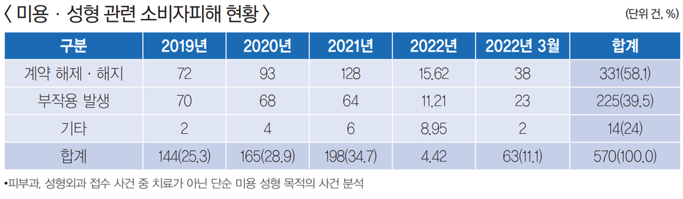 한국소비자원(원장 장덕진)이 2019년부터 2022년 3월까지 접수된 미용·성형 관련 피 해구제 신청 570건을 분석한 결과, 소비자피해가 매년 증가하는 추세이다. 그 중 계약 해제·해지 관련 분쟁이 58.1%(331건) 로 가장 많았다.