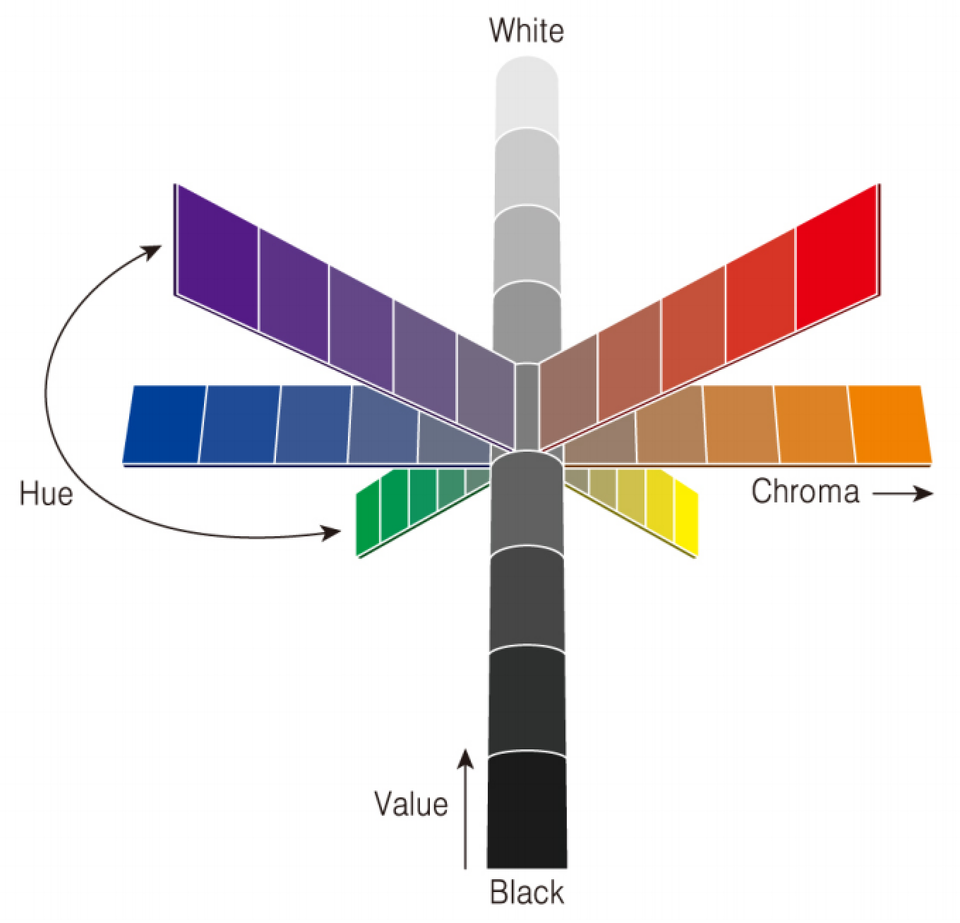 Munsell color system은 색의 3요소를 기준으로 하여 색상(hue), 채도(chroma), 명도(va lue)를 바탕으로 색의 언어를 표현하였다.