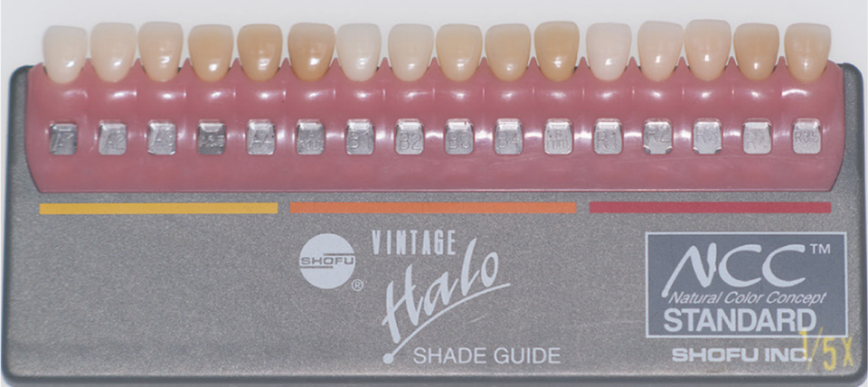 보철할 자연치아와 유사한 색상, 채도, 명도를 띤 shade guide를 고르는 것이다. 특히 색상보다는 명도가 유사한 shade guide 선택이 중요하다.