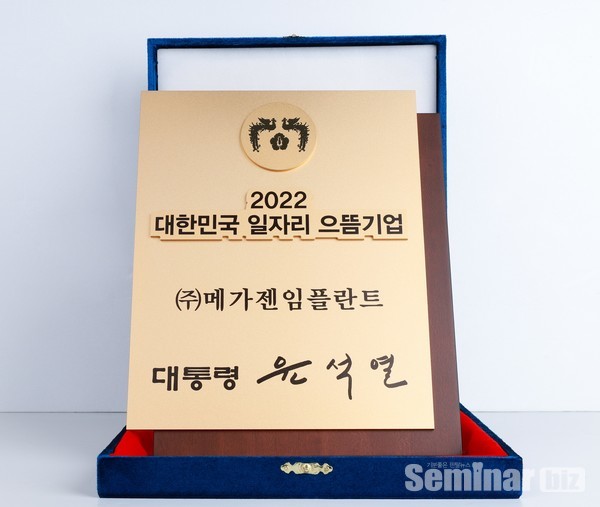 ㈜메가젠임플란트(대표 박광범, 이하 메가젠)는 지난 9일 세종컨벤션센터에서 개최된 고용노동부에서 주관 '2022 대한민국 일자리 으뜸기업’ 인증식에서 대통령 인증패를 받았다.