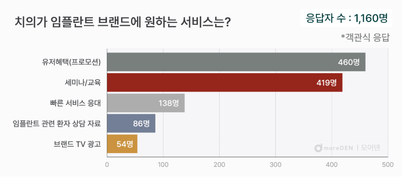 치과의사가 임플란트 브랜드에 원하는 서비스로는 유저혜택과 프로모션(460명), 세미나/교육(419명)이 대부분의 응답을 차지했다. 보통 한 브랜드와 오래 관계를 유지해 나가기 때문에 그만큼 유저에게 많은 혜택을 주길 바라는 것으로 파악된다.