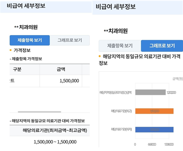 심평원 홈페이지 개편된 것을 보면 **치과의원의 경우 임플란트 금액의 “제출항목 보기”를 클릭하면 150만원으로 나오는 것을 확인할 수 있다. 또한 우측의 “그래프로 보기”를 클릭하면 해당 치과의원의 임플란트 최저, 최고 금액이 나오며, 해당 지역 중간 금액은 120만원으로 나옴을 확인할 수 있다.