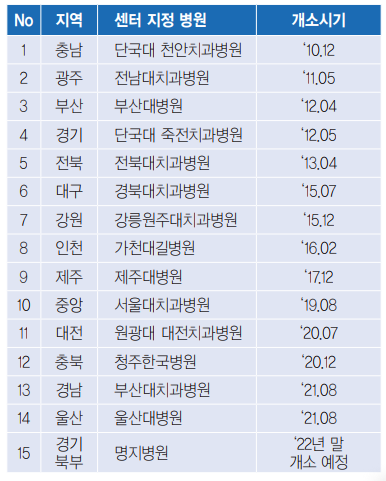한편, 권역별 장애인 구장진료센터는 22년 현재 서울대치과병원 장애인 중앙센터 1개소가 있으며 권역별로 14개소가 설치 운영중에 있다. 앞으로 세종, 전남 , 전북에 설치될 예정이며 오는 2024년말 서울시 권력센터도 개소할 예정이다.
