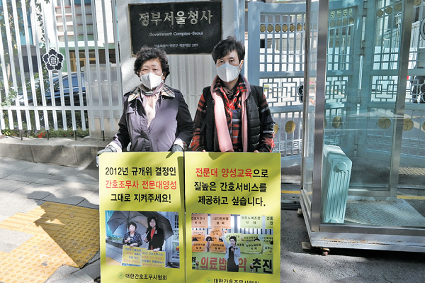 김현자 서울시회장(중앙회수석부회장)과 최승숙 부회장(임상위원장)은 “2012년 규개위 결정인 간호조무사 전문대 양성을 그대로 지켜주세요!”와 “전문대양성교육으로 질 높은 간호서비스를 제공하고 싶습니다.”라는 피켓을 들고 1인 시위를 전개하였다.