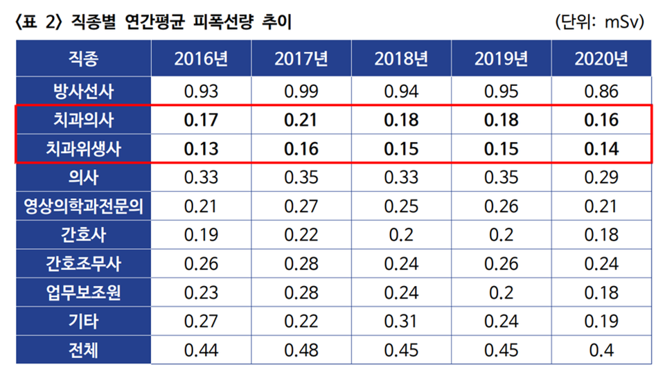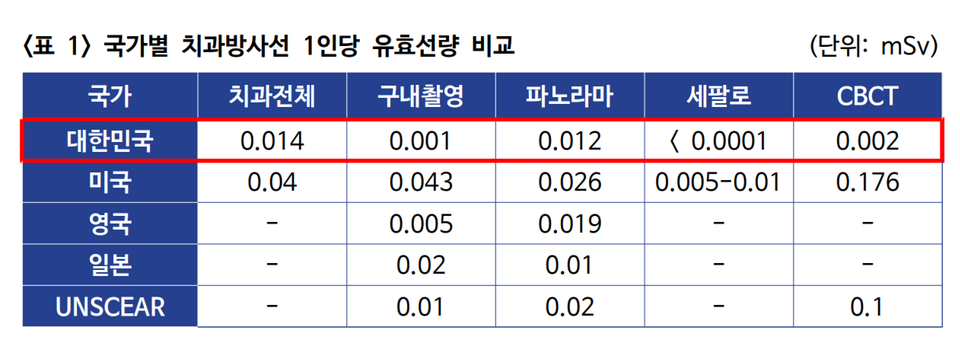 또한 일반 국민의 치과방사선 피폭선량은 국내 0.014mSv, 미국 0.043mSv, 영국 0.005mSv 등으로 낮았고, 치과 종사자의 피폭선량 역시 타 직종보다 매우 낮았으며, 국외에서도 동일한 결과였다.