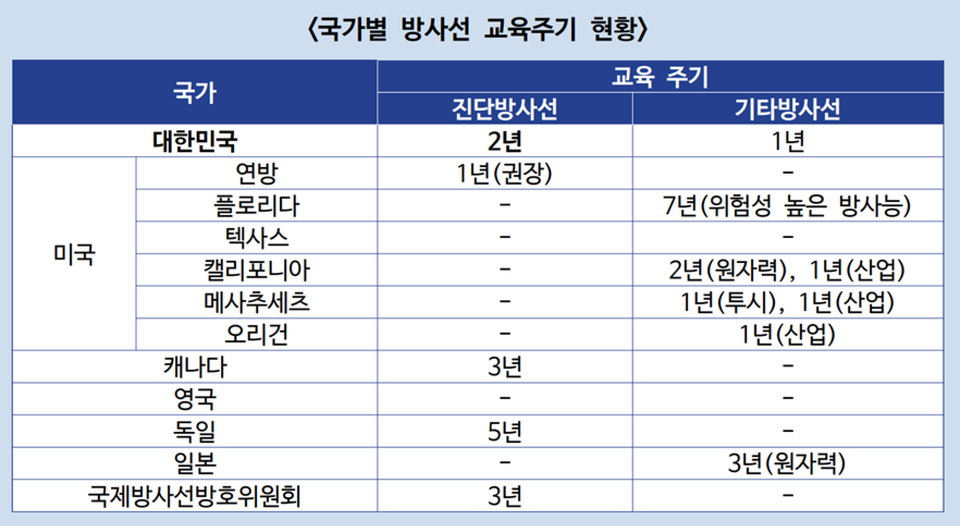 연구 결과에 따르면, 미국, 캐나다, 영국, 독일, 일본의 사례를 살펴봤을 때, 위험성 높은 원자력, 산업방사선의 교육이 1-3년의 주기를 가진 것과 달리 치과 진단용 방사선 교육의 주기를 별도로 규정하고 있지 않고, 2년 주기로 교육을 시행하는 국가는 없었다.
