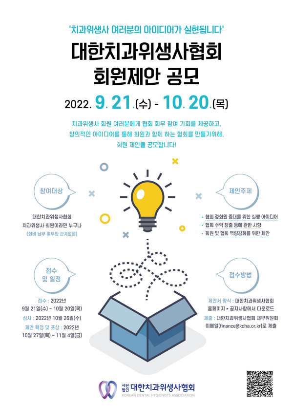 이번 제안 공모 참여 대상은 치위협 준회원과 미등록 회원을 포함한 전체 회원 모두이다. 제안서 접수는 오는 10월 20일(목)까지 한 달간 이메일(finance@kdha.or.kr)로 보내면 된다.