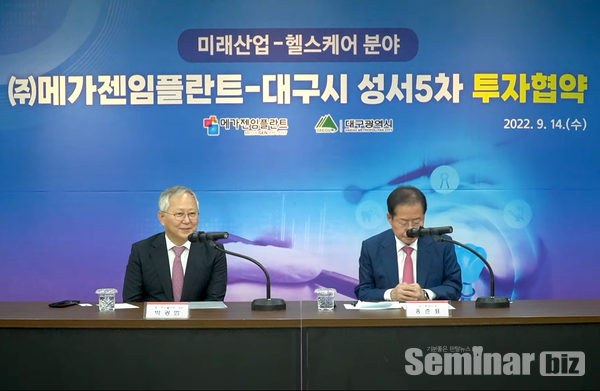 ㈜메가젠임플란트(대표 박광범, 이하 메가젠)는 대구시와 ‘메가젠임플란트 제2공장 설립’을 위한 투자협약을 체결했다<사진>