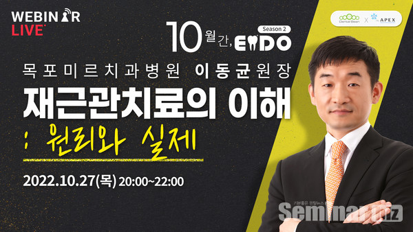 국내 최대 치의학 온, 오프라인 교육플랫폼 덴탈빈(대표 박성원)이 'Online Seminar 월간엔도 시즌 2 강의가 오는 10월 27일 목요일 저녁 8시부터 10시까지 온라인 스트리밍으로 중계한다.