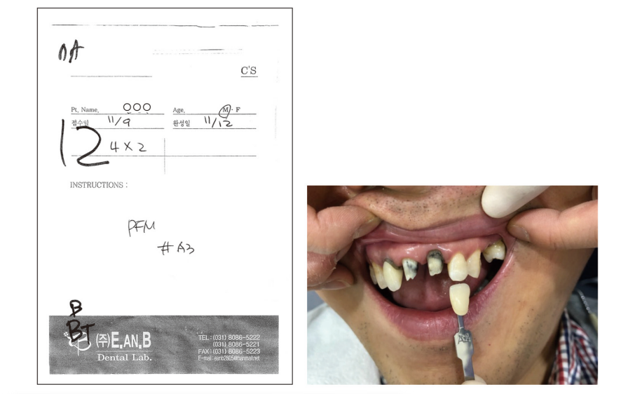 치과기공소 소장님의 협조로 다른 치과에서 보낸 전치부 색상정보 전달 방법을 입수했다. 아직도 종이에 필기하여 간단하게 기본 색상만 기록하여 보내는 기공의뢰서도 있다.