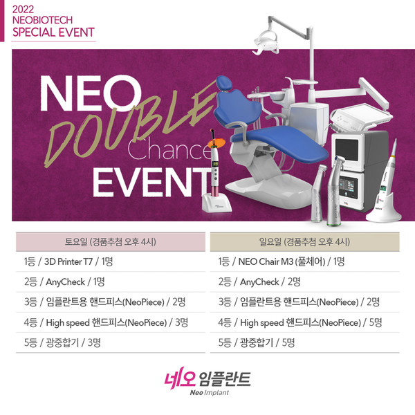 네오 공식 SNS 팔로우와 네오포럼 회원가입 시 스타벅스 상품권을 증정한다. 이 채널들을 통해 추후 임상 정보 및 세미나 일정 등 다양한 정보를 얻을 수 있다. 뿐만 아니라 네오 부스에서 체어 체험 및 상담만 받기만 해도 응모가 가능한 캡술 뽑기를 통해 다양한 경품을 증정할 예정이다.