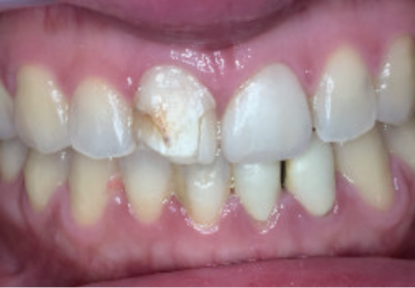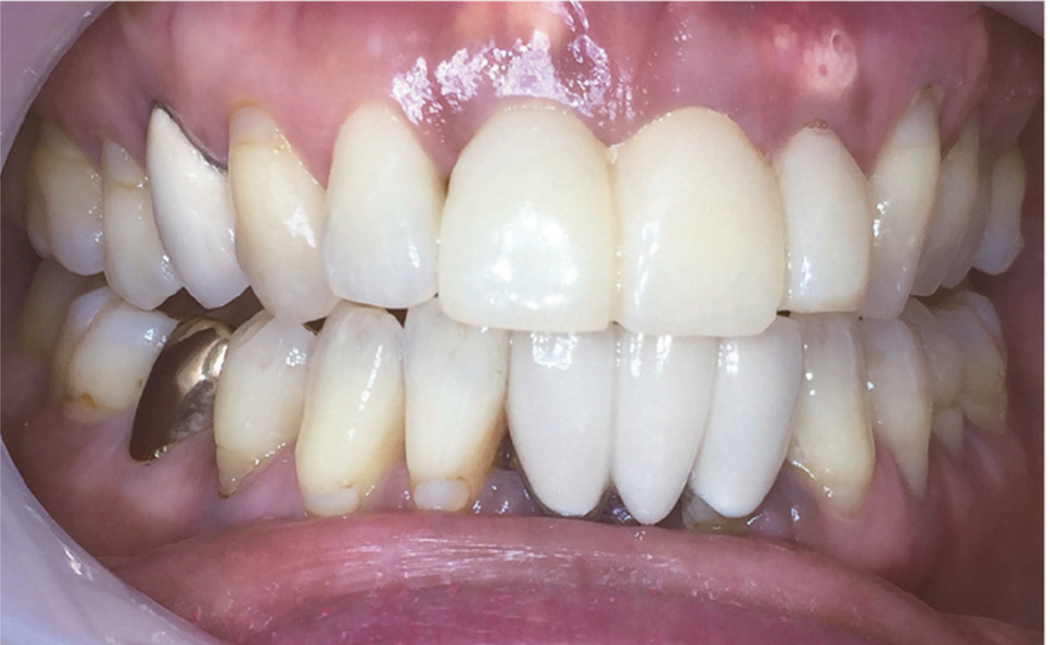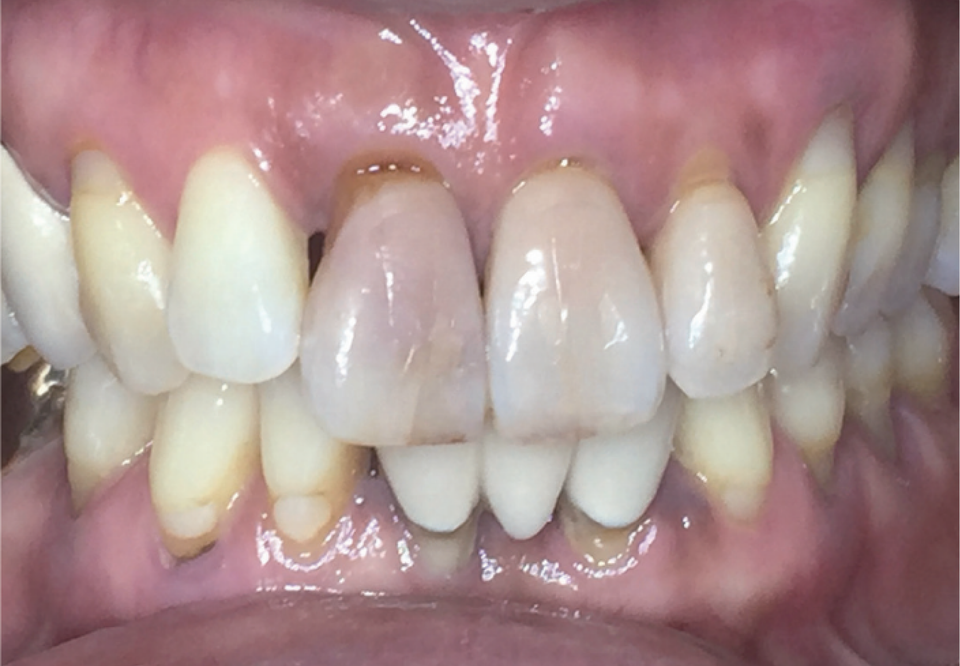50대 여성으로 5년 전 넘어져서 전치부 손상을 입었다. 그동안 방치하다가 치근단염증과 변색으로 치과에 내원하였다. 근관치료와 보철을 계획하였다.