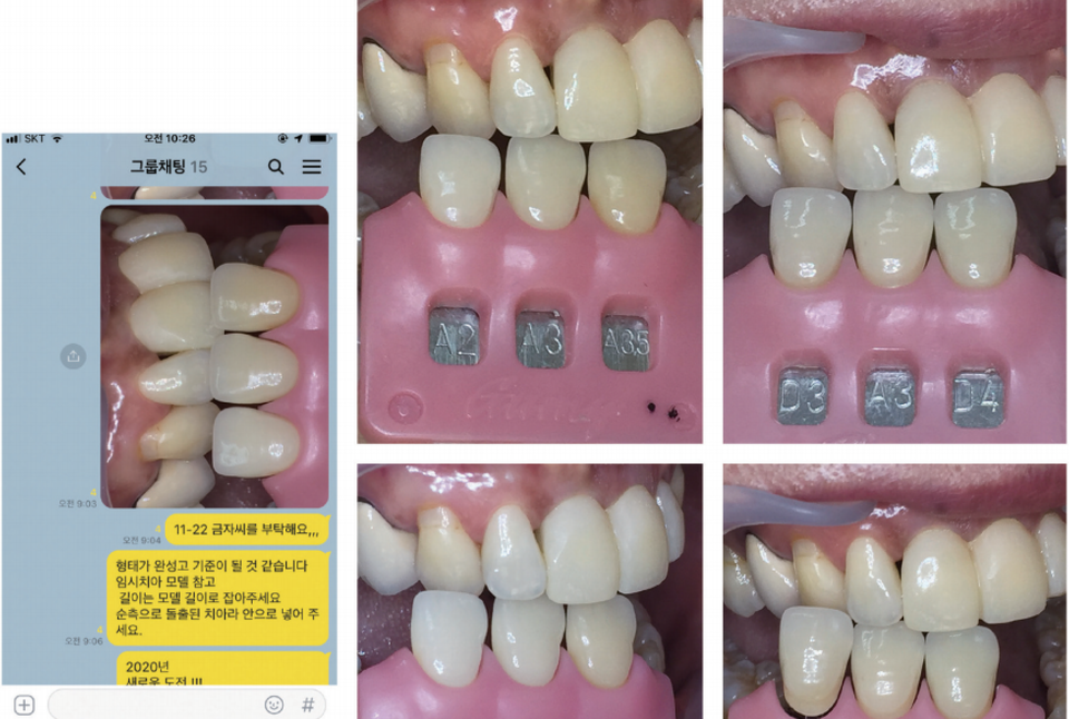 좌측 중절치 laminateveneer보철이 측절치 치경부 색상을 비교하면 입체감이 떨어진다. 중절치와 측절치 사이에서 애매한 보철제작을 하였다.