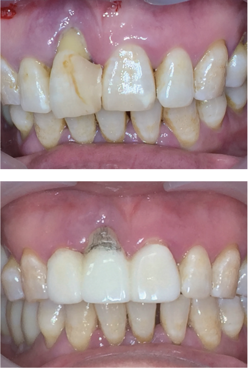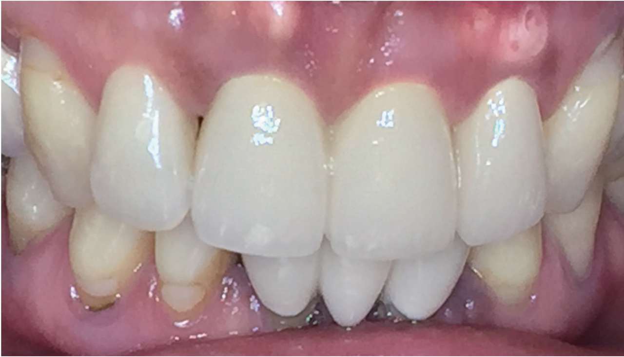 상방으로 길어진 pontic 부위에 대한 보철 방법에 관한 충분한 대화가 필요하였다. 결국 길어진 부위는 치은색으로 처리하기로 하였다.