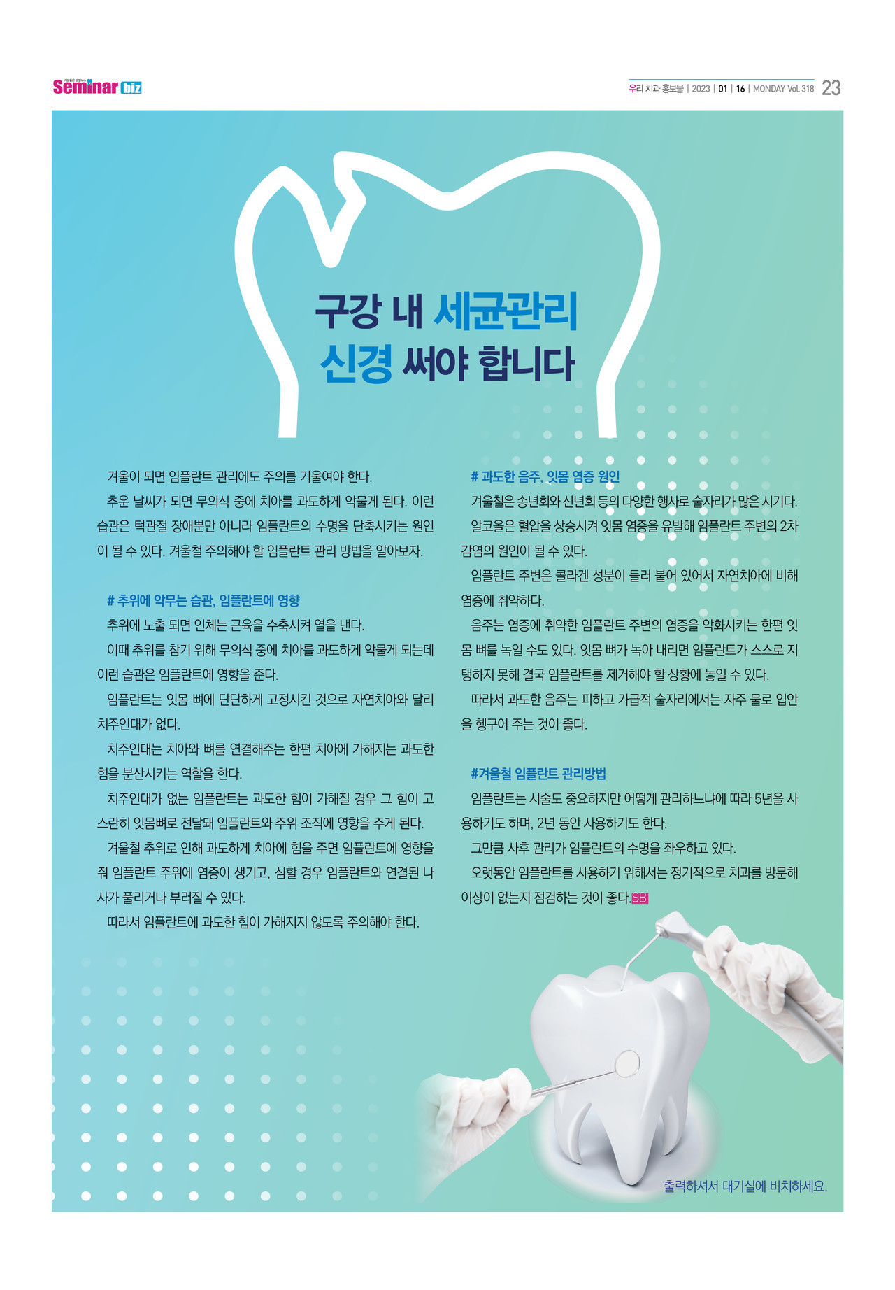 겨울이 되면 임플란트 관리에도 주의를 기울여야 한다. 추운 날씨가 되면 무의식 중에 치아를 과도하게 악물게 된다. 이런 습관은 턱관절 장애뿐만 아니라 임플란트의 수명을 단축시키는 원인이 될 수 있다. 겨울철 주의해야 할 임플란트 관리 방법을 알아보자.