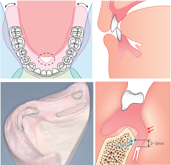 이 힘을 이용하려면 틀니 변연을 mylohyoid ridge 하방으로 2~3mm 연장해야 한다.