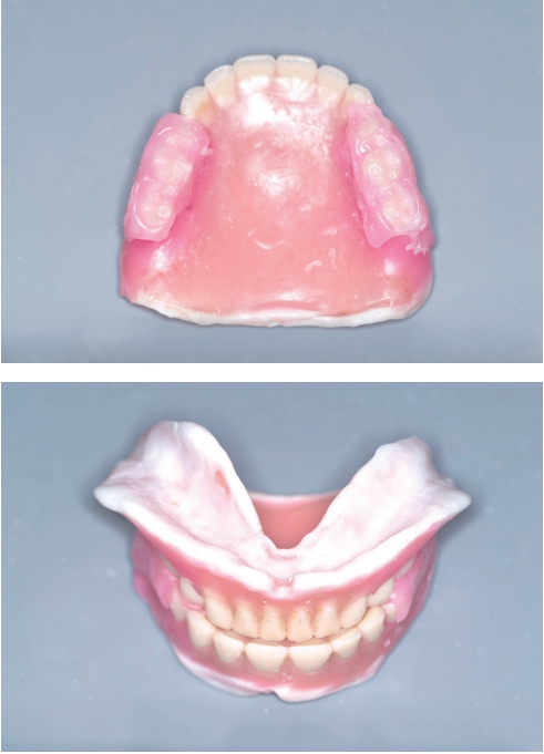 다. Treatment denture상에서 제2대구치를 삭제했으나 완성 틀니에서는 어금니 2개를 넣어 달라는 환자의 요구를 수용하여 소구치 레진 치아를 1개 줄이고 구치부 레진 치아 2개를 새로 배열하였다.