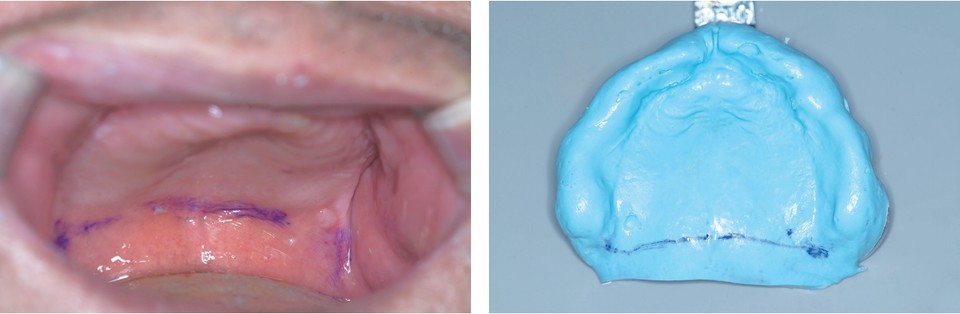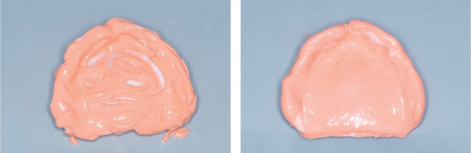 상악에서는 흐름이 좋은 light body 실리콘 인상재를 사용한다. Tissue conditioner와 인상재 사이에 접착제는 필요하지 않다.