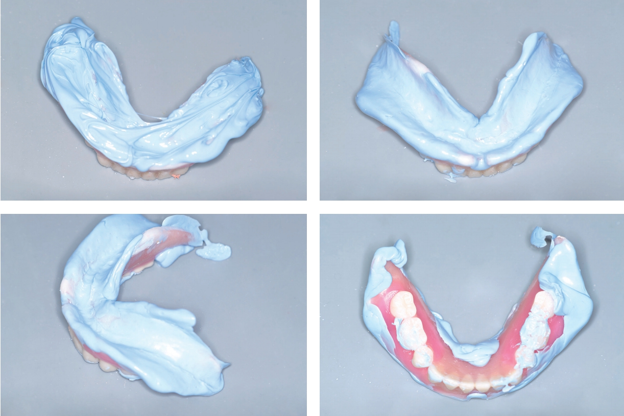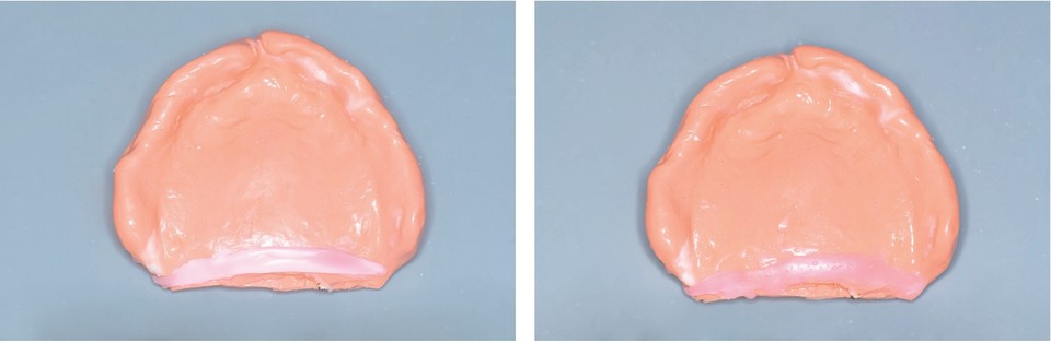 하악 인상에서는 하악 틀니 교합을 확인 후 환자에게 ‘침을 삼키도록’ 요구한다. 연하 시에 움직이는 협·설측 근육들 활동 범위를 한 번 더 인지할 수 있다.