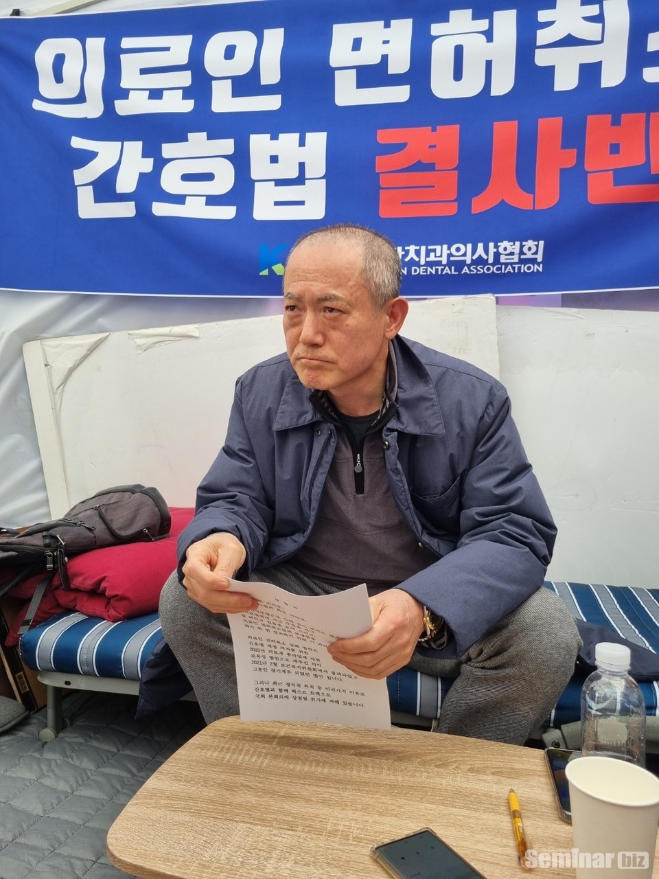 “그동안 본회의 상정 가능성도 있었지만, 이 사태를 우려하는 회원님들이 국회 보건복지위원들께 항의 전화와 이메일, 문자를 보내고, 이어서 13개 보건의료단체와 함께 총궐기대회를 하는 등 우리의 많은 노력을 통해 지연되었다고 생각한다”며 “현재 대한치과의사협회도 중요한 현안이 있다. 그렇지만 더 중차대한 의료인 면허취소법의 폐기를 위해서 저는 삭발을 하고, 또한 지난 금요일부터 지금까지 단식 투쟁을 통해서 이 법안의 부당함을 알리고 있다“고 강조했다.