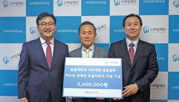 스마일재단(이사장 나성식)은 원광대학교치과대학 총동창회(회장 정찬)에서 모금한 성금 500만원을 저소득 장애인 보철치료비 지원기금으로 전달받았다.