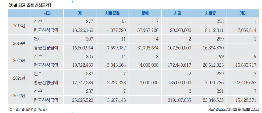 지난 5년간 치과 평균 조정신청 금액을 보면 2018년에는 1천 8백 326만 원이었으며 2019년에는 1천 6백 808만 원, 2020년에는 1천 9백 722만 원이었다. 2021년에는 1천7백 747만 원, 2022년에는 2천 5백 25만 원으로 지난해 대비 7백 2십여 만 원이 올라갔다. 신청 건수중 보철이 88건으로 가장 높았다. 뒤이어 임플란트(71건), 발치(35건), 교정(14건), 의치(12건), 기타 (11건), 처치(4건), 진단 (1건) 순이었다.